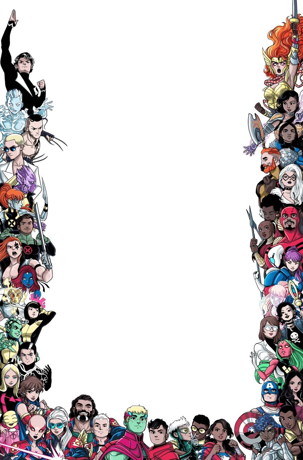 had the first look at the cover. llustrated by Luciano Vecchio, the characters will serve as a “frame” around the main cover art, hence the empty white space in the preview art. The whole left side of the cover is taken up by members of the X-Men and other mutants. Representatives from the X-Men include Northstar, Iceman, Mystique, and Shatterstar. The Guardians of the Galaxy make up the bottom left hand corner, and while there are not as many Guardians represented as there are X-Men, they still have a nice presence; the Guardians of the Galaxy are represented by Hercules, Marvel Boy, Moondragon, and, , among others. There are also plenty of heroes from outside the two teams, such as America Chavez, Black Cat, the newest Valkyrie, and Angela, once a member of the Guardians herself.
